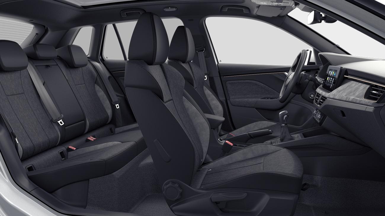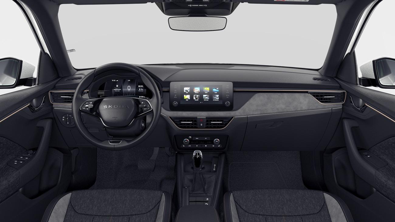 Innenausstattung Design Selection LODGE Stoffbezüge Lodge Schwarz/Grau mit Kontrastline Copper, Dekor Suedia Grau, Interieurleisten und Luftausströmerumrandung Schwarz glänzend mit Kontrastline Copper, LED-Ambientebeleuchtung (2-farbig, Weiß oder Rot), Mittelarmlehne hinten