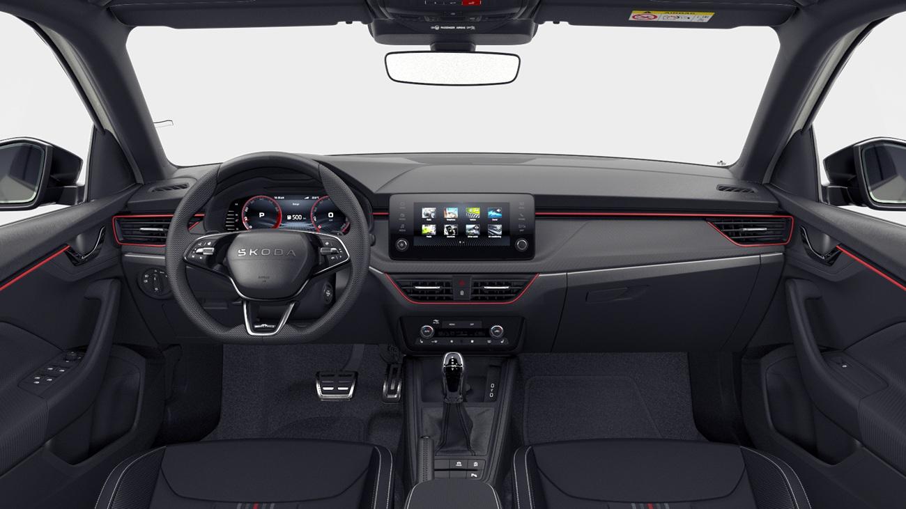 Innenausstattung Design Selection MONTE CARLO, Stoff in Schwarz und Rot, Sportsitze vorn mit integrierter Kopfstütze, Dekor Monte Carlo Carbon, Interieurleisten und Luftausströmerumrandung in Schwarz glänzend mit Kontrastline in Rot, LED-Ambientebeleuchtung (2-farbig, weiß oder rot), Mittelarmlehne hinten, Türeinstiegsleisten, Pedalerie in Edelstahl-Optik